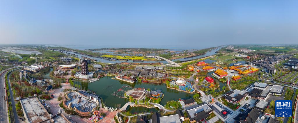 4月8日拍摄的宿迁骆马湖畔皂河龙运城景色(无人机照片)。