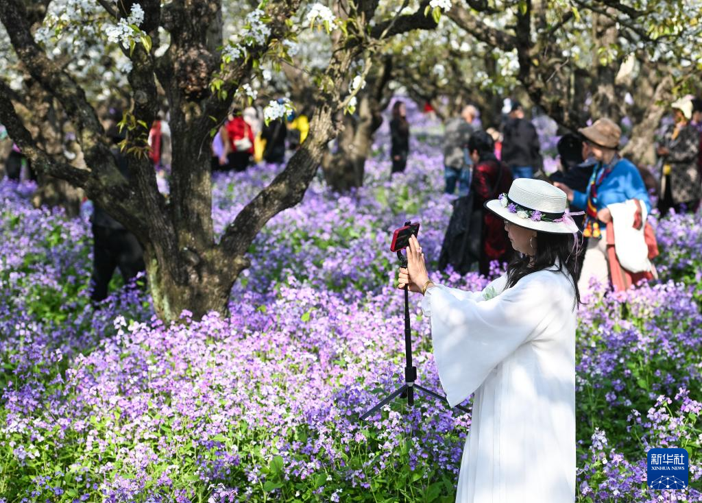 4月8日,游人在江苏三台山国家森林公园观赏、拍摄梨花和二月兰。