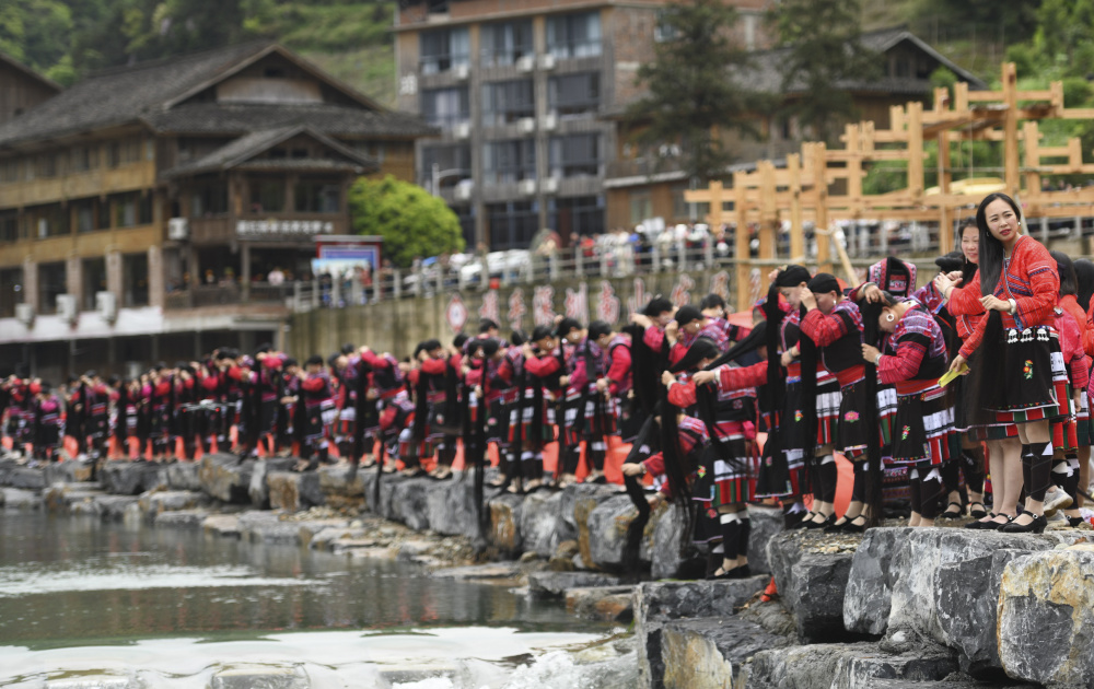 4月11日,在龙胜县黄洛瑶寨,瑶族妇女在河边梳洗长发。新华社发(潘志祥 摄)