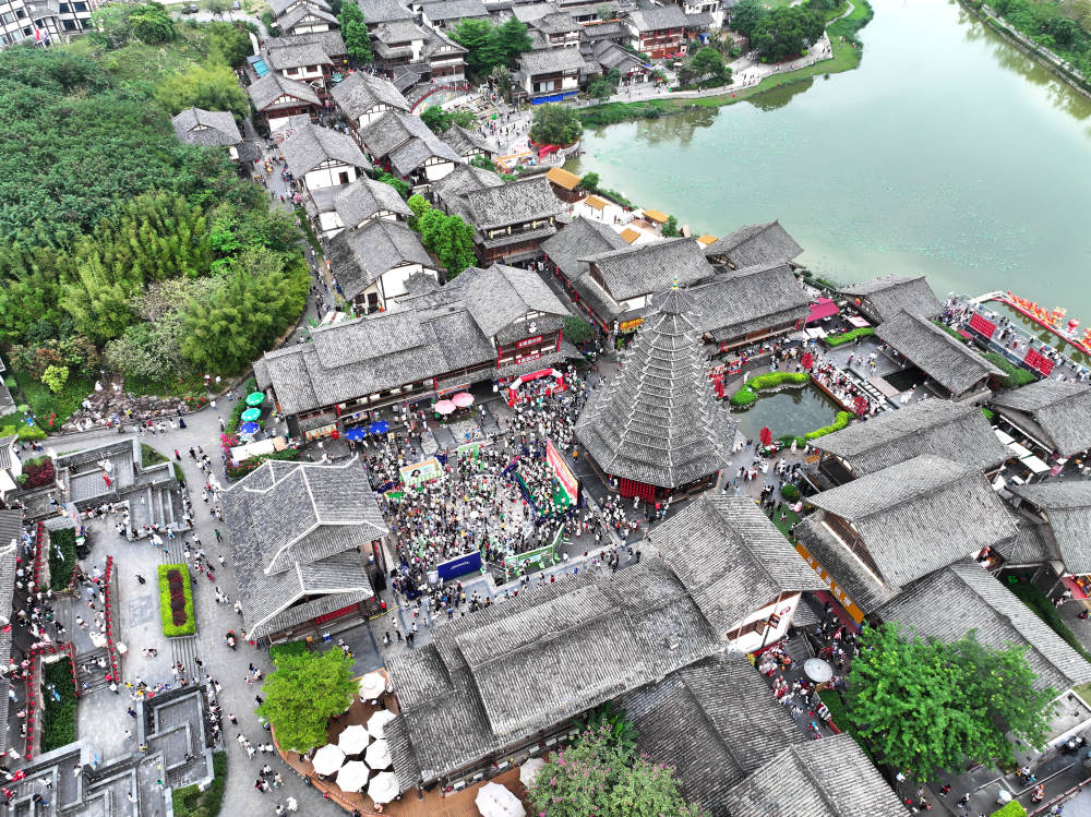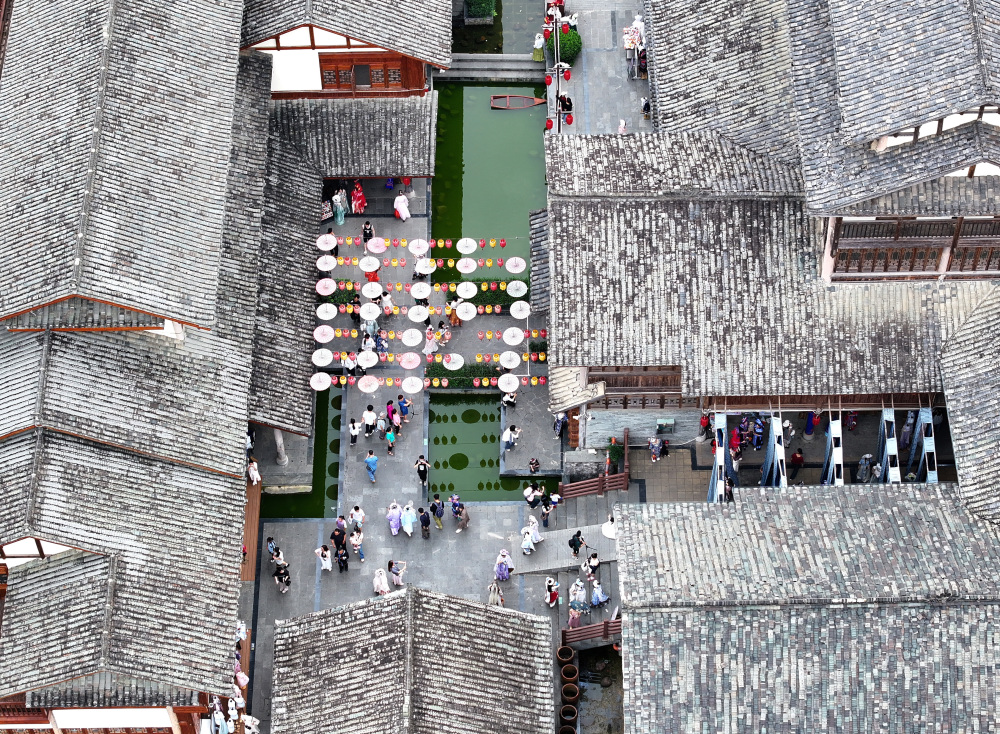 4月12日,人们在广西南宁市相思小镇游览(无人机照片)。新华社记者 周华 摄