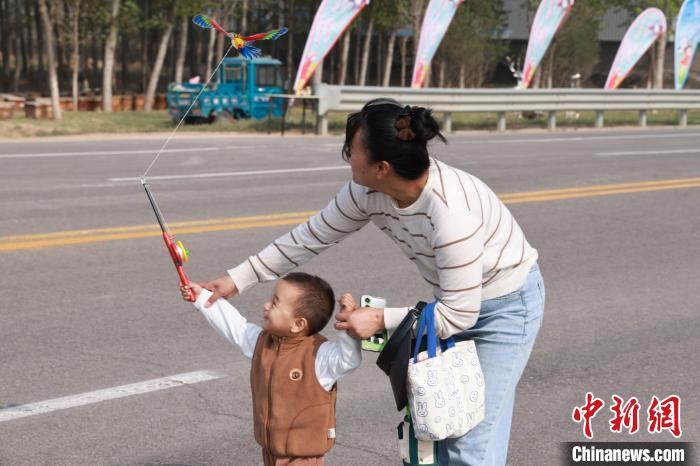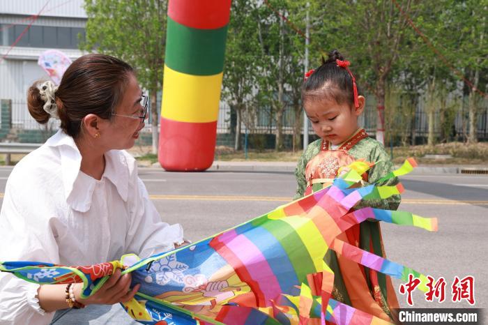 4月13日,一游客在活动现场陪孩子放飞小风筝。齐红雨 摄