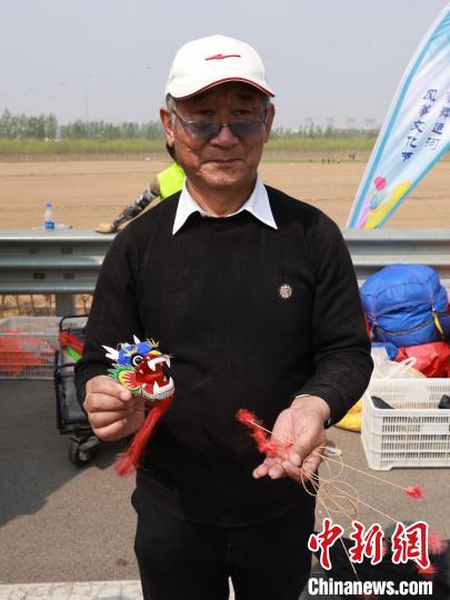 4月13日,风筝爱好者正在展示龙型风筝构造。齐红雨 摄