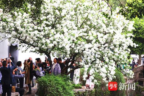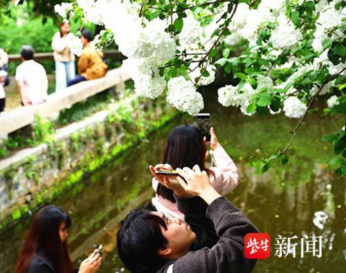 14日下午,天气多云。记者在南京总统府景区看到,一株高大的绣球花静静地依偎在太平湖边,树冠枝条挂满花朵,白色绣球大团大团白色花朵簇拥在一起,树下到处都是赏花人。绣球花互相依靠,一团团,一簇簇,随风摇曳,层层叠叠的视觉效果,吸引市民游客前来打卡拍照。