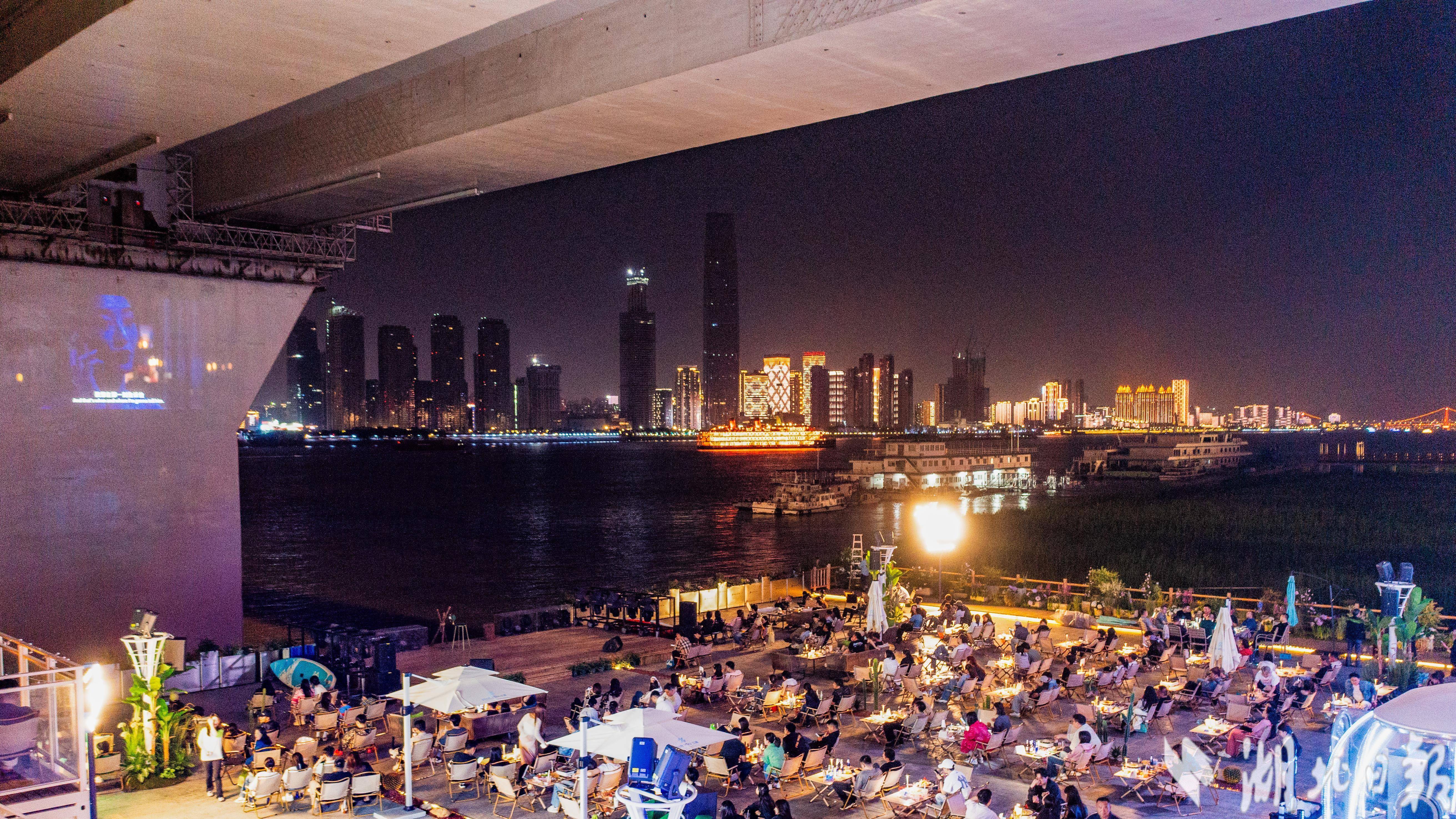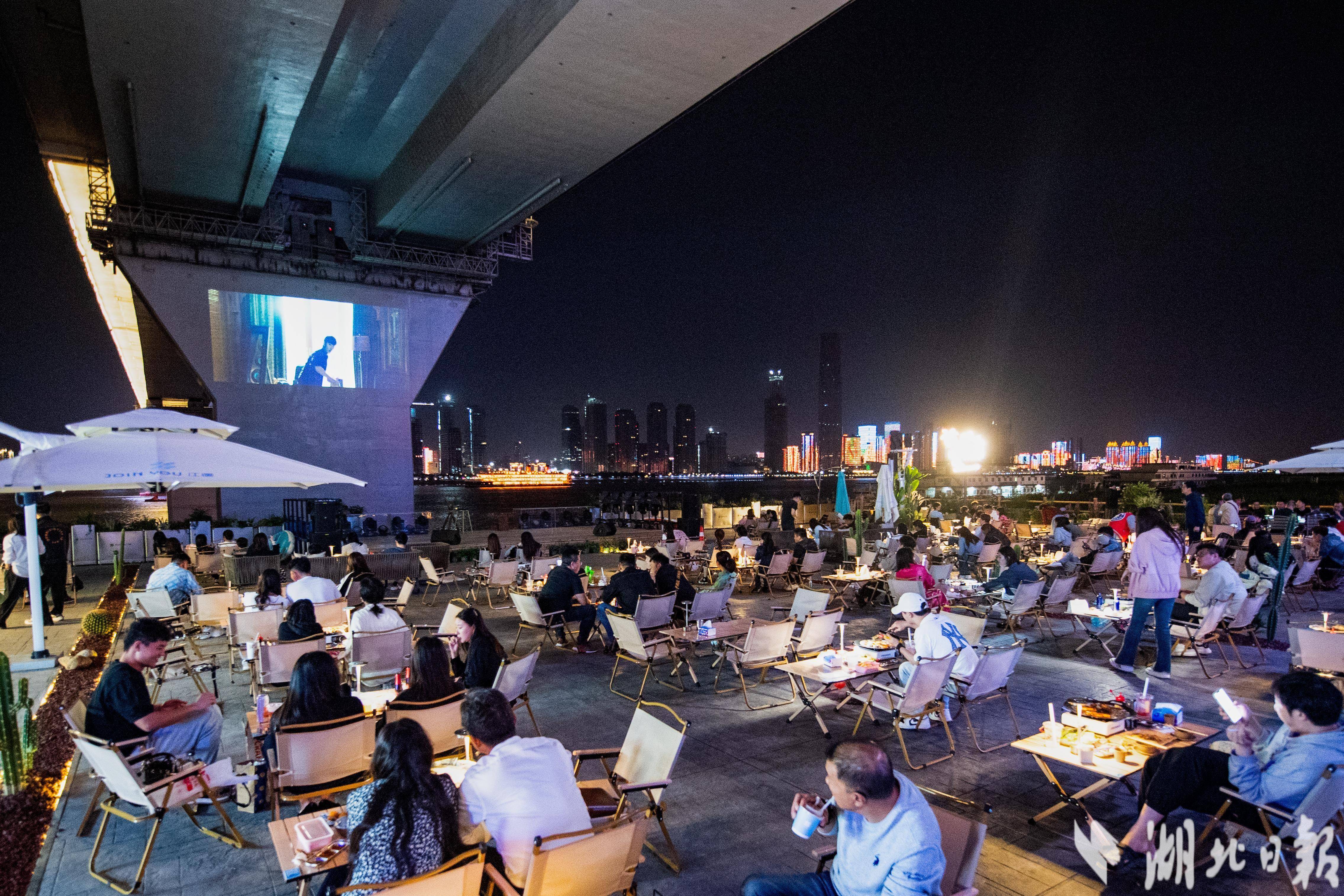 据现场工作人员介绍,该项目作为一个集文艺社交、游玩赏景、沉浸式观影的多元化聚集地,自试营业以来吸引不少年轻游客光顾打卡,常常座无虚席,一座难求,高峰期等位时长近2小时。近年来,发展户外夜经济已成武汉扩大内需、促进消费的重要举措之一,多元化的夜间餐饮、文化娱乐、旅游等活动层出不穷,进一步释放了武汉文旅经济的潜力。(湖北日报全媒记者 何宇欣 通讯员 肖艺 摄)