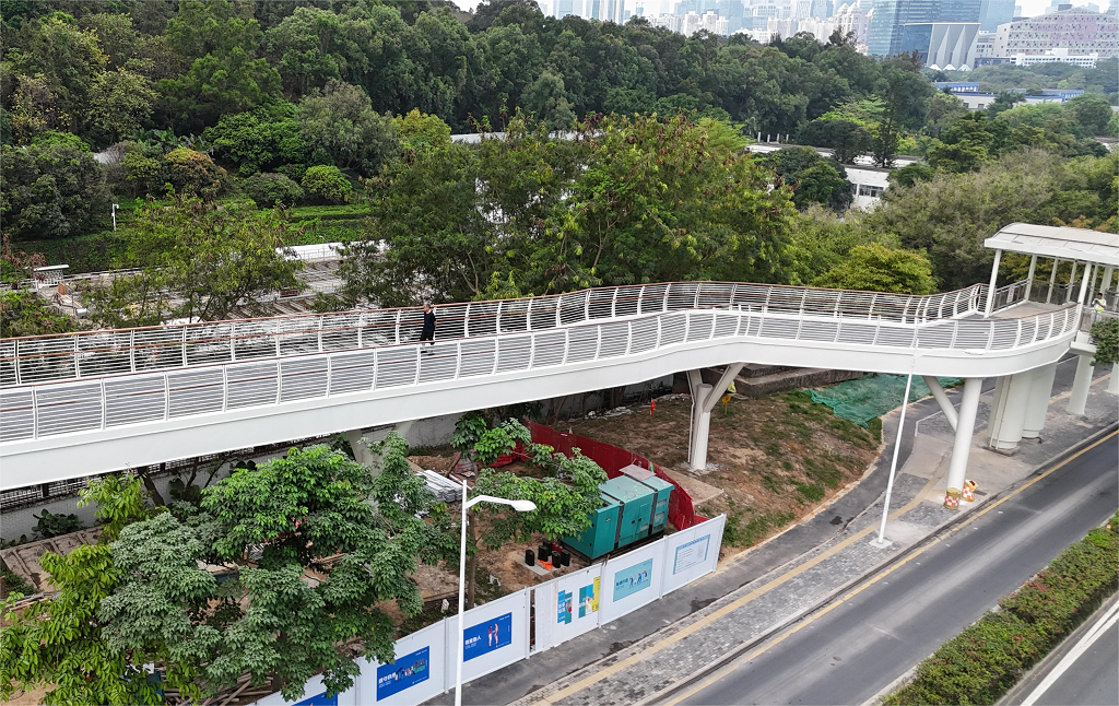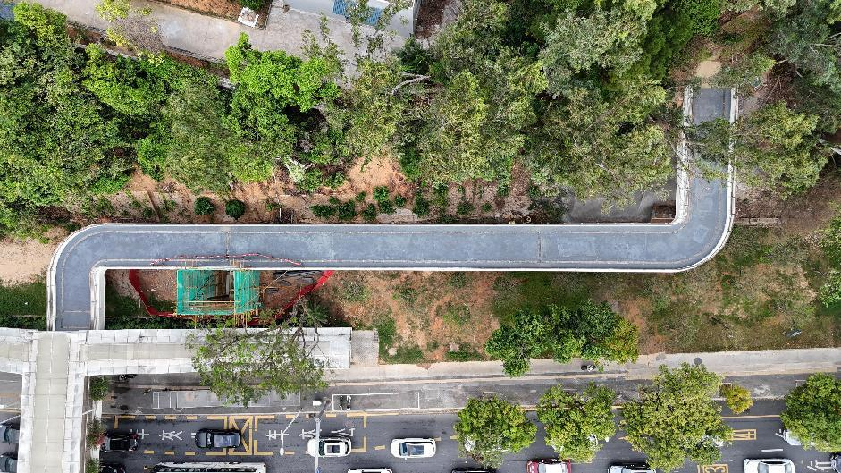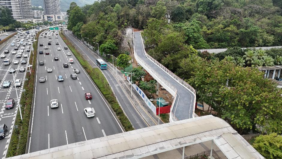 为打造深圳人家门口的山海连城生活,满足市民环保健康休闲需求,提升慢行绿色生活品质,深圳重点推进福田区中部“五园连通”。笔架山-银湖山公园步道连通工程位于福田区北环珍珠岭天桥两侧,为“五园连通”跨北环大道断点建设项目,南接笔架山公园手作步道,北接银湖山郊野公园手作步道,其中南侧钢栈桥总长为107.3米,北侧钢栈桥总长为80米,宽度均为4.5米。同时,按无障碍要求,在天桥南北侧各增设垂直电梯1座。
