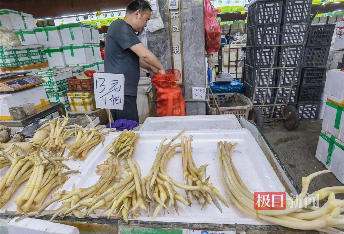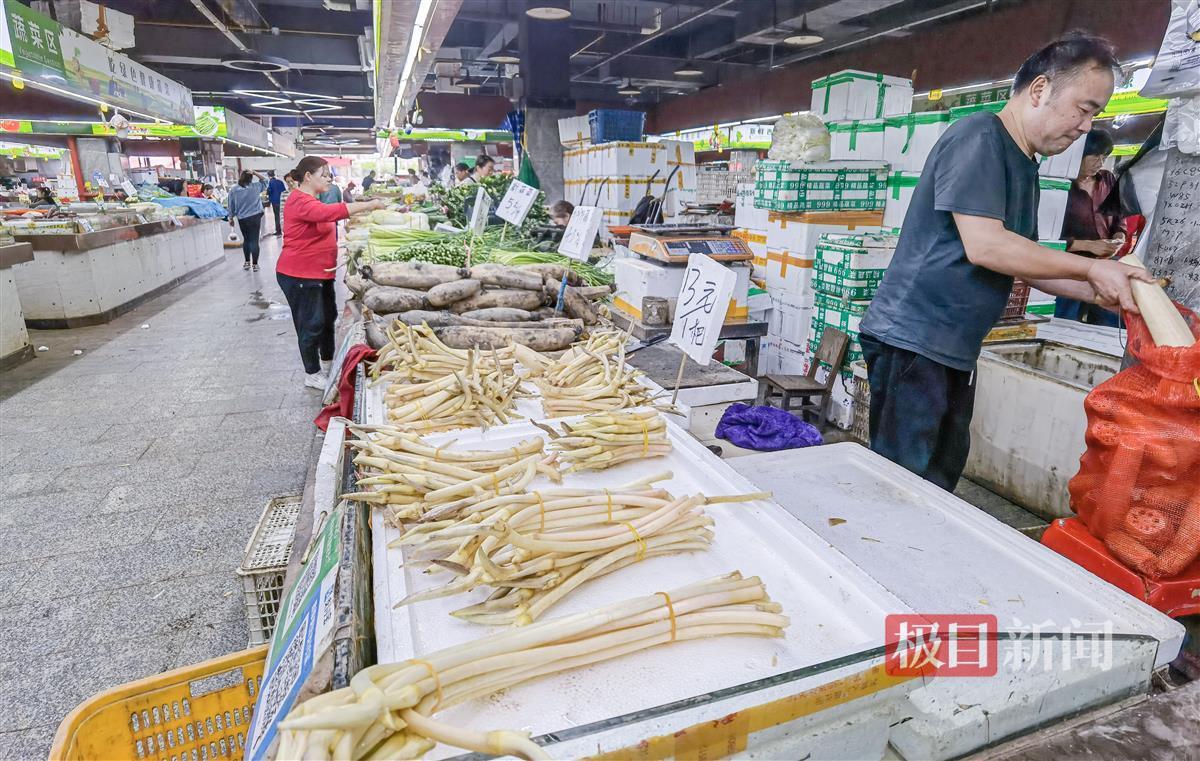4月22日,在武汉光谷立信生鲜市场,买菜的市民曹先生惊奇地发现,藕带已经开始出售了。