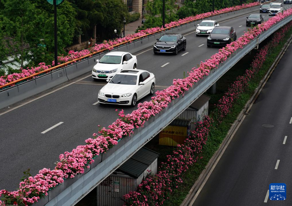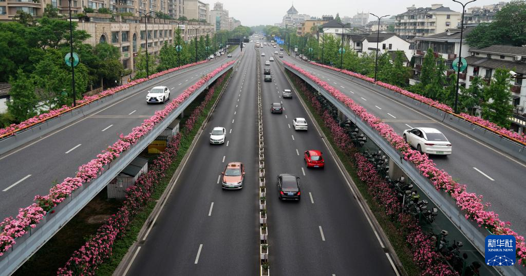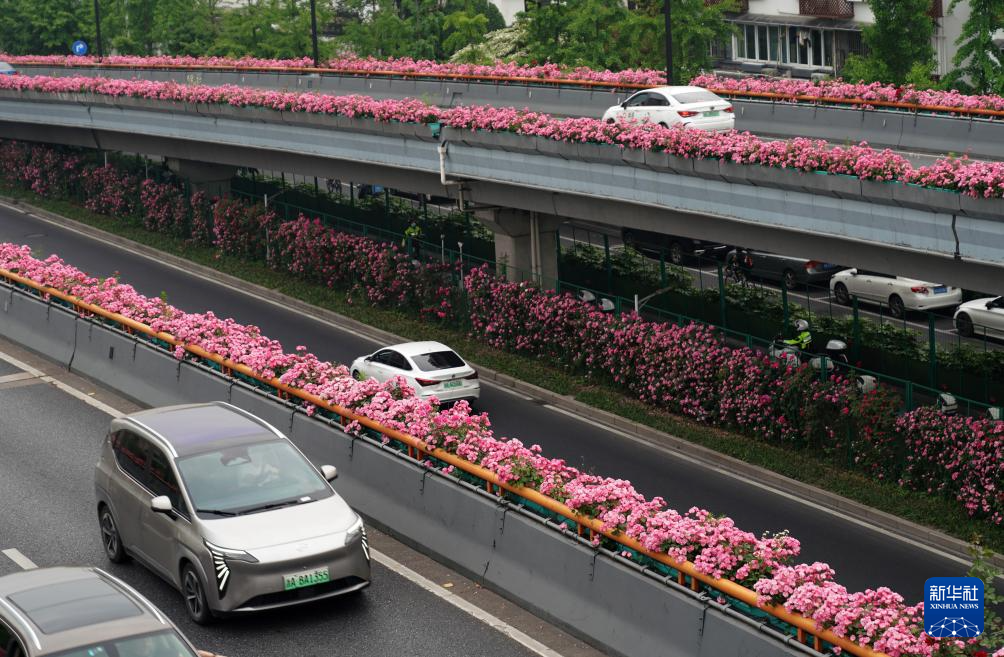 近日,杭州高架道路两侧种植的月季花渐次绽放,形成“空中花廊”,车行其中,美不胜收。