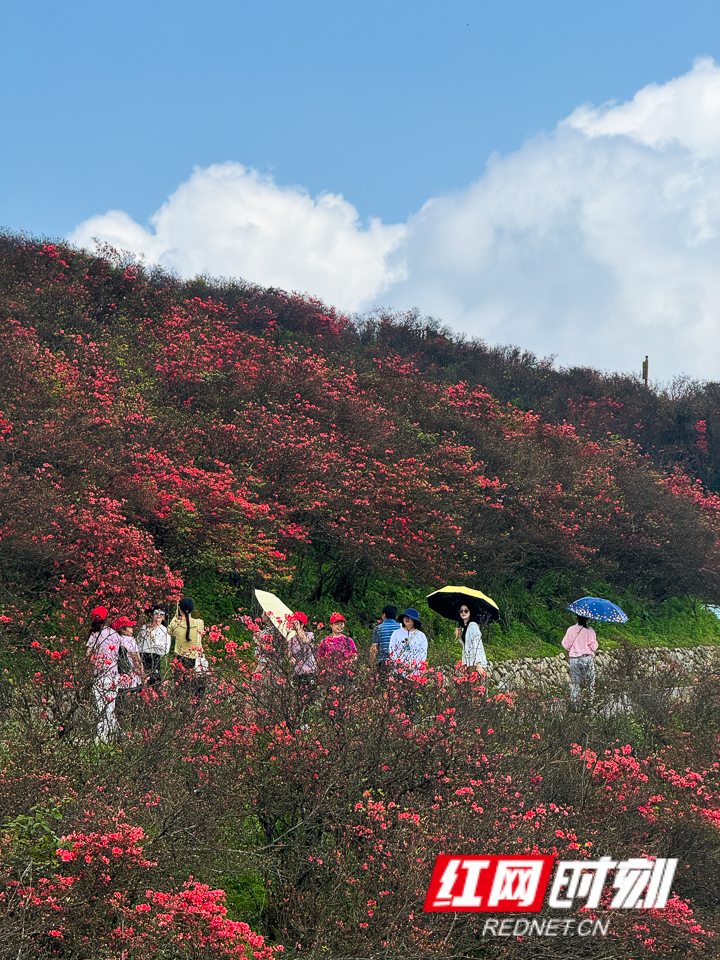 粉嫩成片的云锦杜鹃、漫山红遍的映山红、猴头杜鹃、鹿角杜鹃……二十余种杜鹃层层叠叠,从山腰盛放绵延至山顶,灿若云霞、花开成“海”。