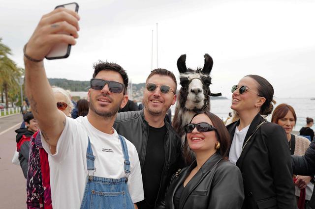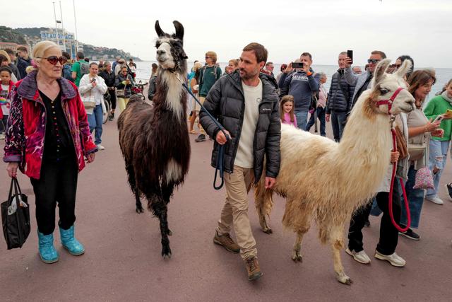 4月28日,人们在法国尼斯海滨与羊驼合影。新华社/法新