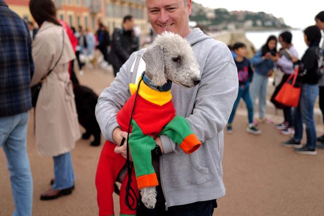 4月28日,一名男子在法国尼斯展示宠物犬。新华社/法新