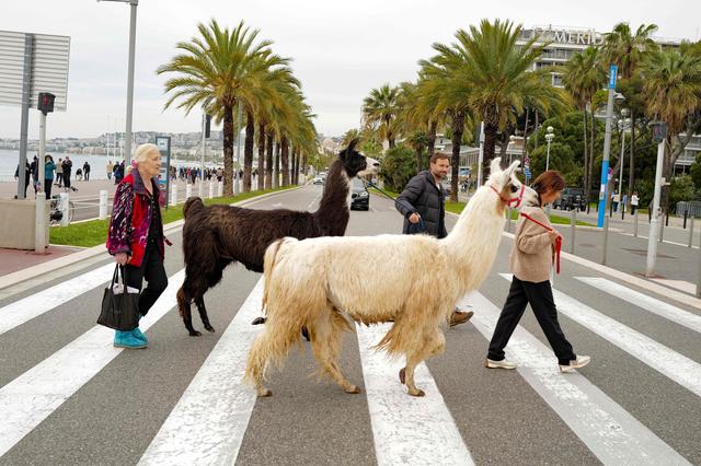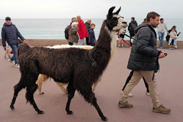 4月28日,人们牵着羊驼走在法国尼斯海滨。新华社/法新