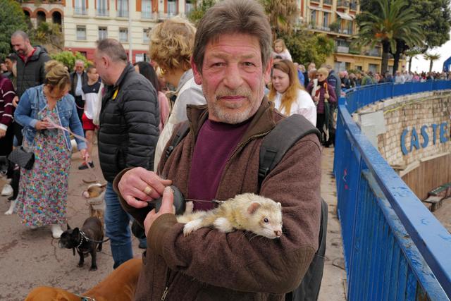 4月28日,一名男子在法国尼斯展示宠物貂。新华社/法新