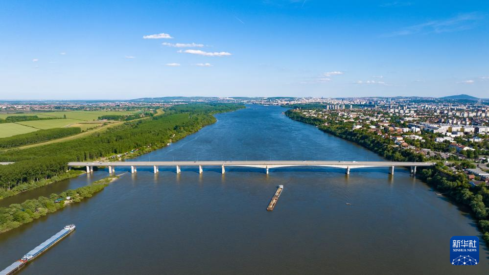 塞尔维亚贝尔格莱德多瑙河上的普平大桥(2024年4月28日摄,无人机照片)。