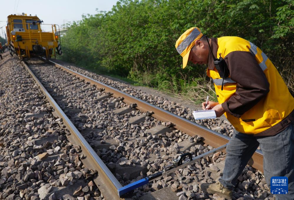 5月2日,国铁集团郑州局郑州工务机械段作业人员在核对捣固后的线路几何尺寸。