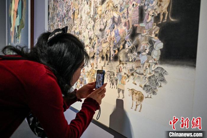 观展女孩用手机记录展出作品上的人物细节。记者刘忠俊摄