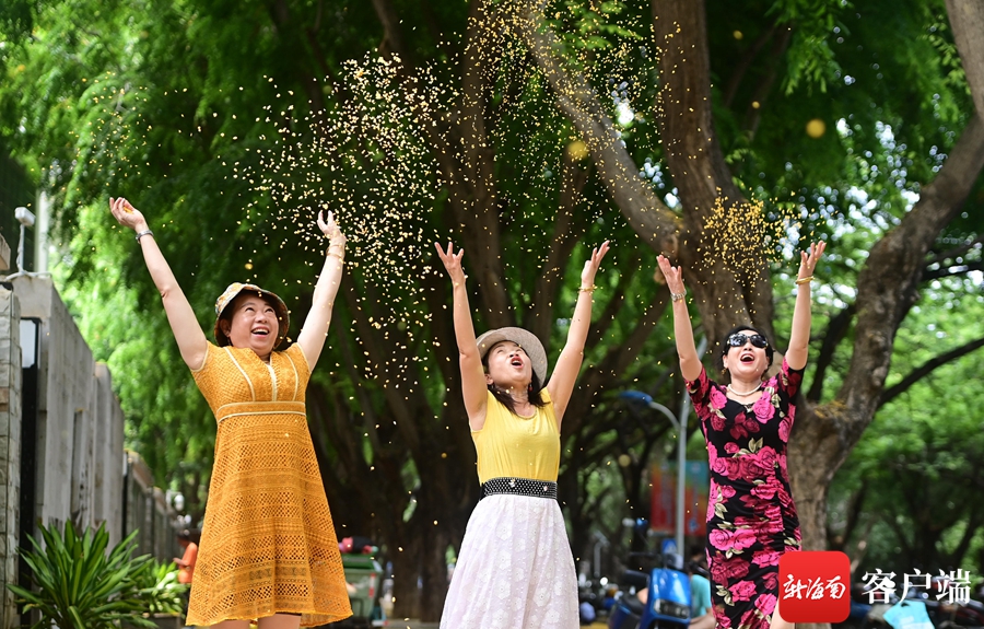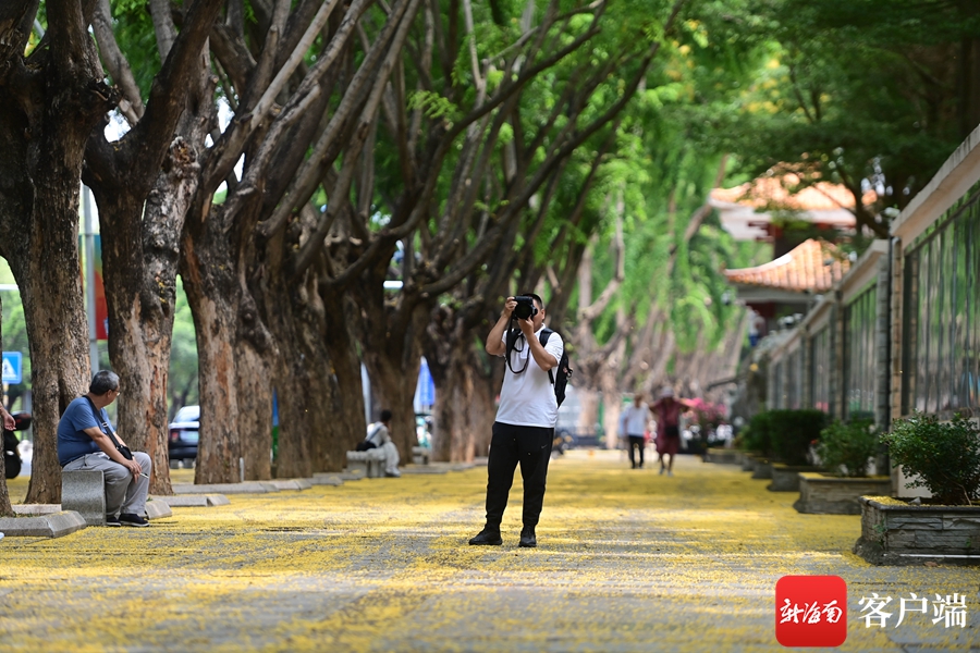 五月的三亚,正是紫檀花开时节,微风轻轻吹拂,金黄色的花儿落满地,远远看去好似给大地铺上一层金色的地毯,煞是好看,吸引不少市民围观拍照。