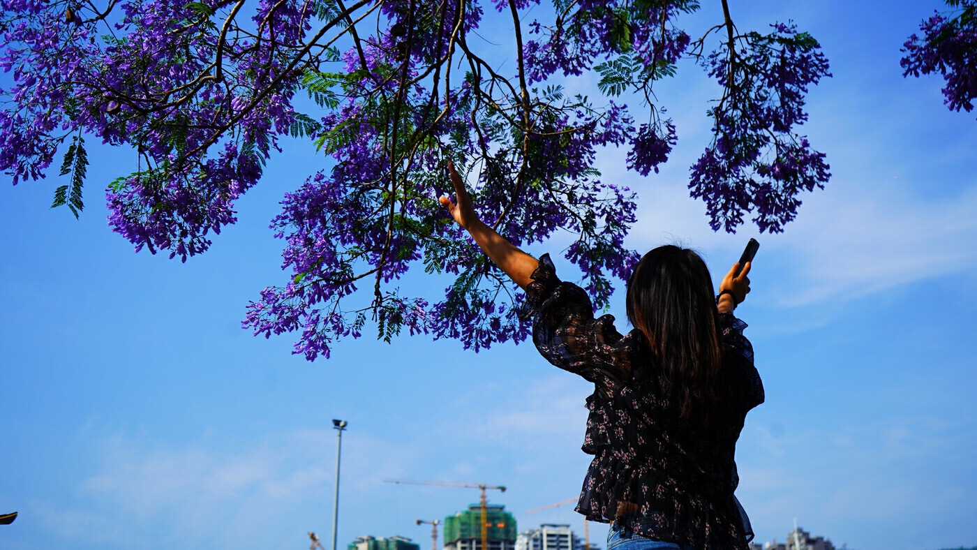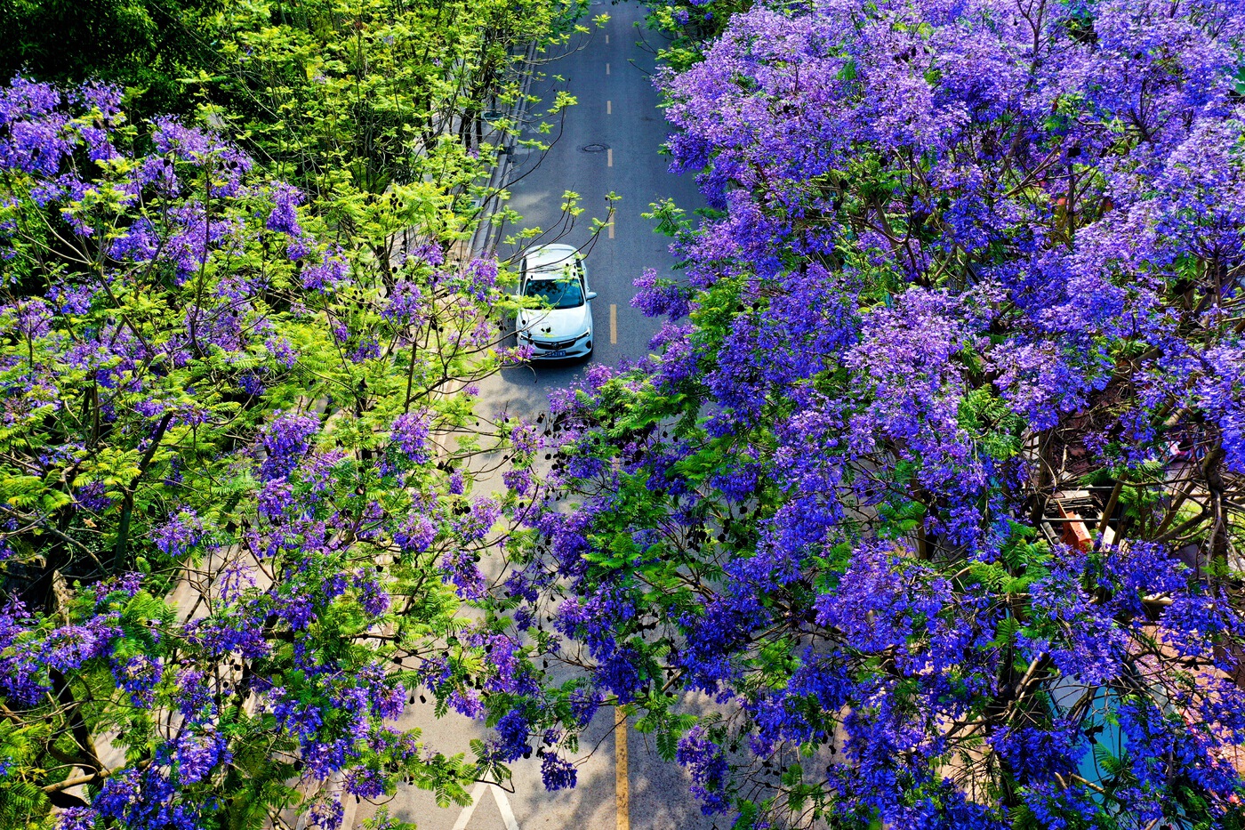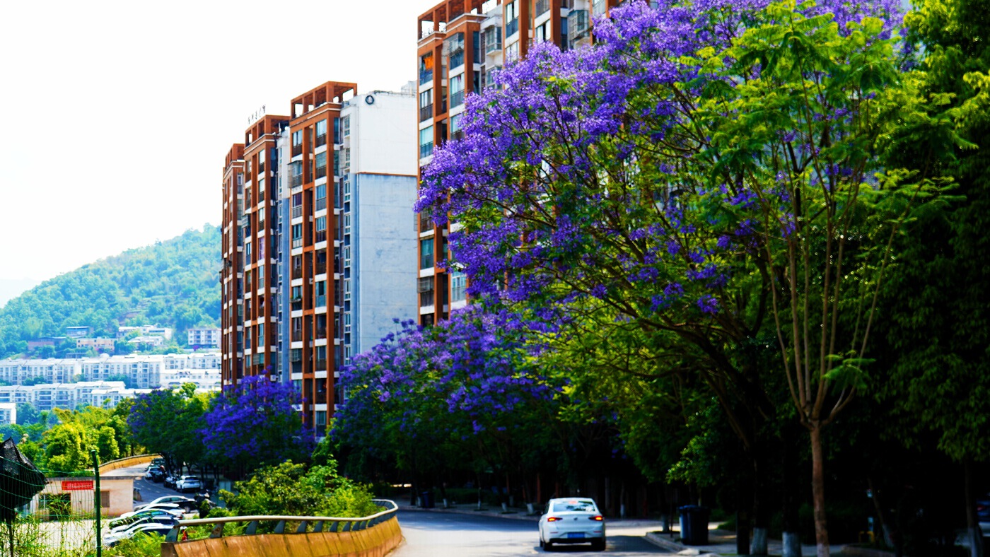 紫英轻轻,花瓣悠悠,一树一景。眼下,灿烂的蓝紫色花朵把天空和街道连成了一片宁静惬意的烟云,给滨江小城增添了一抹浪漫的景致,吸引广大居民游客们漫步花间,赏花拍照,尽情享受初夏时节的浪漫气息。