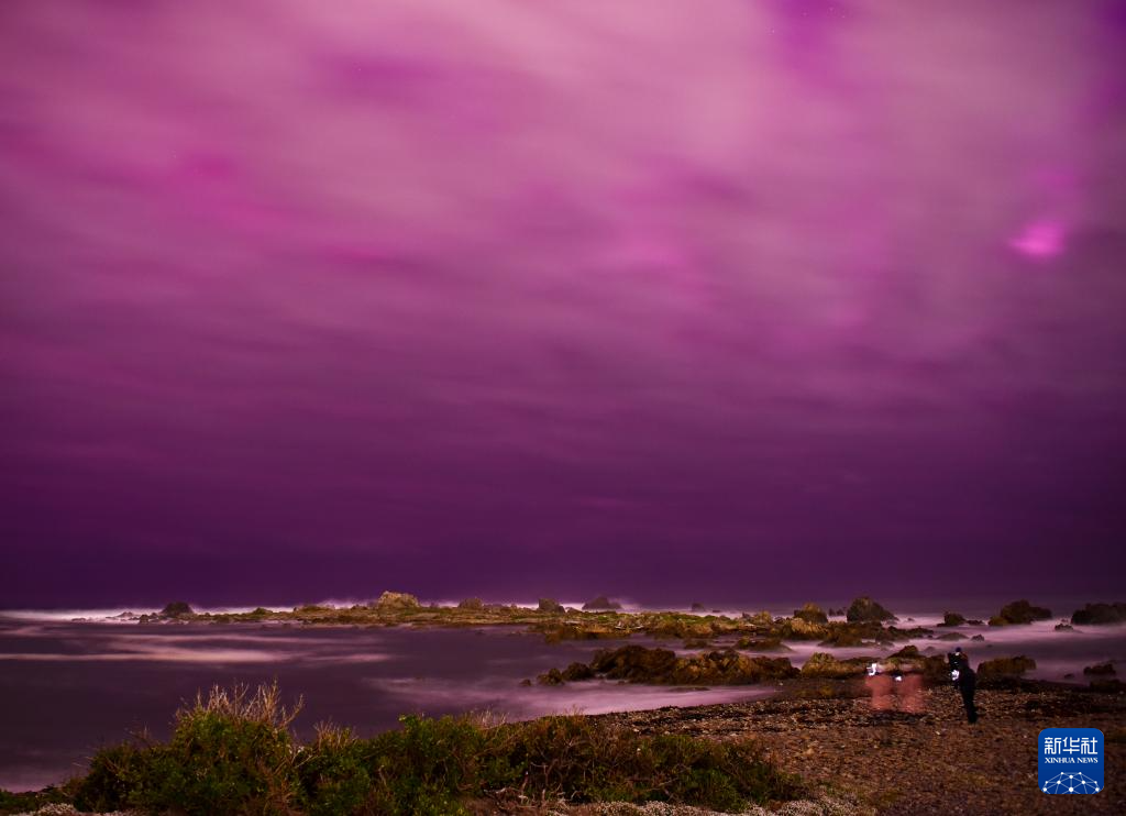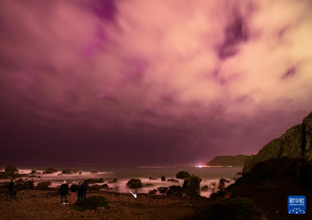 这是5月11日晚在新西兰首都惠灵顿南郊海岸线拍摄的极光。