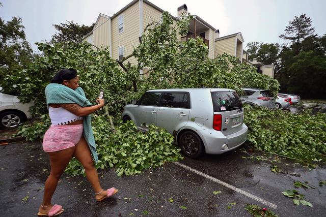 5月10日,在美国佛罗里达州塔拉哈西,一名女子拍摄因强风暴倒落在车辆上的树木。新华社/美联