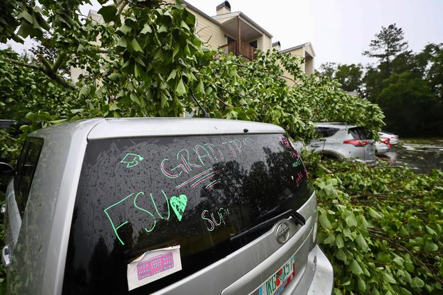 5月10日,在美国佛罗里达州塔拉哈西,遭强风暴破坏的树木倒落在车辆上。新华社/美联