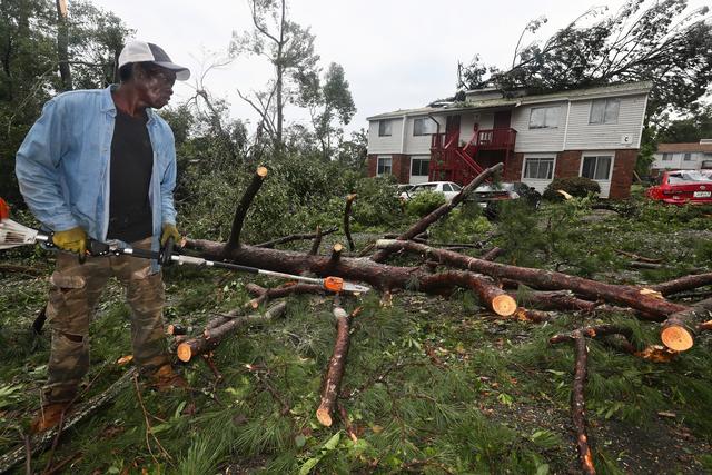 5月10日,在美国佛罗里达州塔拉哈西,一名男子清理因强风暴倒落在房屋前的树木。新华社/美联