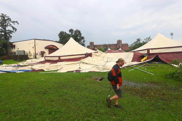 5月10日,在美国佛罗里达州塔拉哈西,一名男子经过遭强风暴破坏的帐篷。新华社/美联