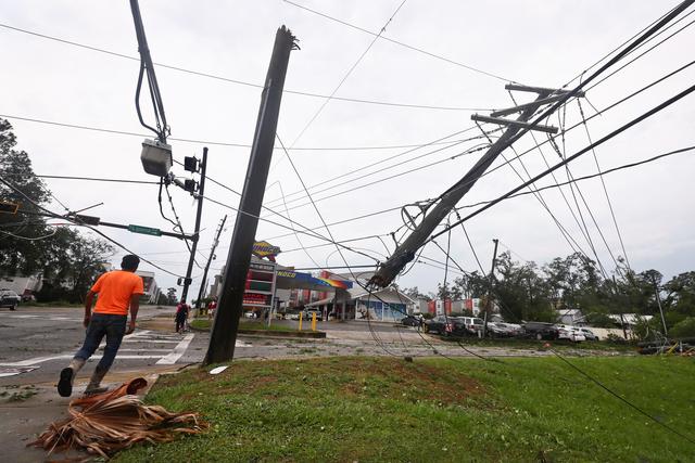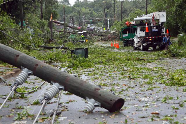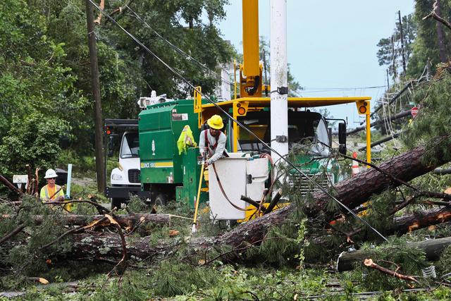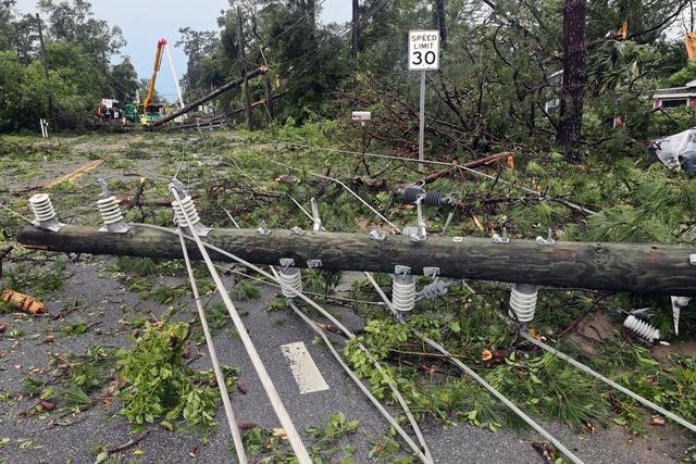 5月10日,在美国佛罗里达州塔拉哈西,工作人员清理遭强风暴破坏的电线杆和电线。新华社/美联