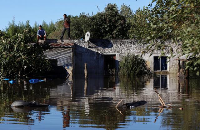 5月9日,在乌拉圭三十三人城,当地居民站在遭洪水侵袭房屋的屋顶上。新华社/路透