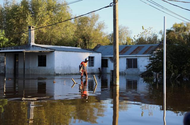 5月9日,在乌拉圭三十三人城,一名男子在被洪水淹没的街道上涉水前行。新华社/路透
