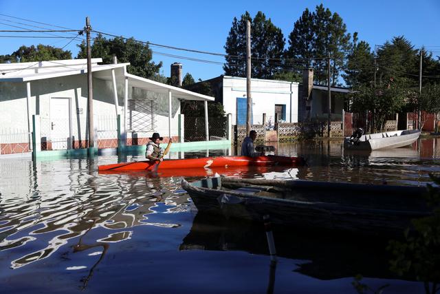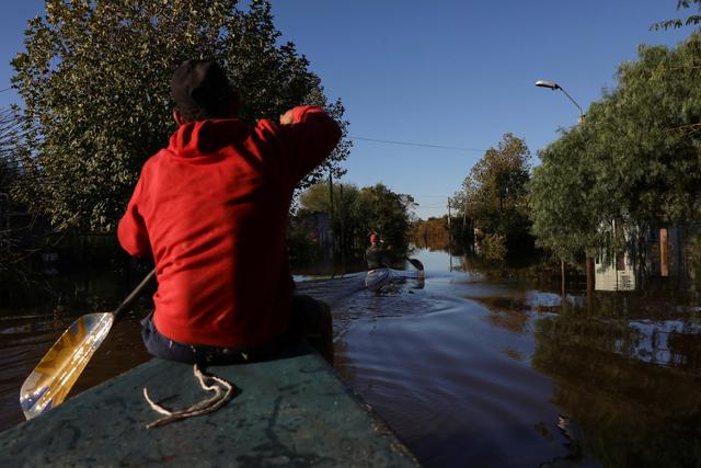 5月9日,在乌拉圭三十三人城,当地居民划船查看遭洪水侵袭的区域。新华社/路透