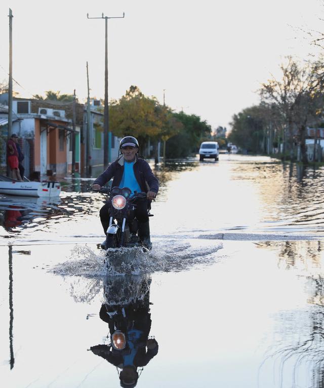 5月9日,在乌拉圭三十三人城,当地居民在被洪水淹没的街道上骑行。新华社/路透