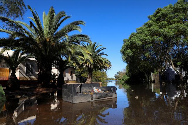 这是5月9日在乌拉圭三十三人城一处被洪水淹没的街道上拍摄的一张沙发。新华社/路透