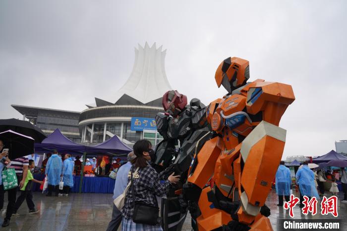 现场民众与消防员扮演的“机器人”互动。王以照 摄