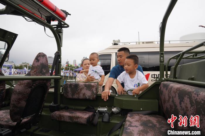 市民带着家人近距离体验两栖救援车。王以照 摄