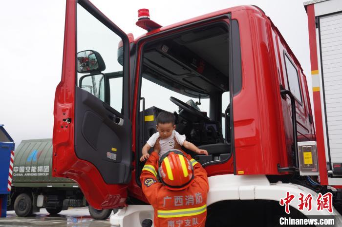 消防员将一位儿童抱上消防车驾驶位体验。王以照 摄