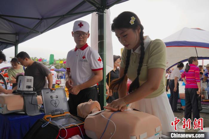 市民在工作人员指导下学习急救技巧。王以照 摄