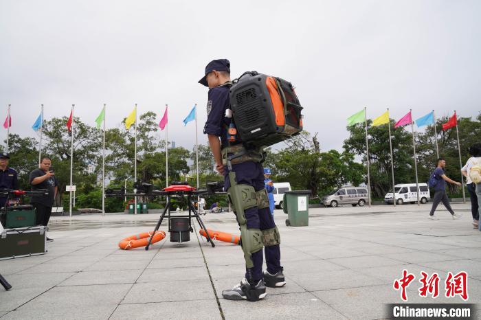 一位民间救援队队员展示人体外骨骼背负设备。王以照 摄