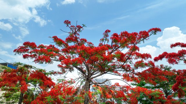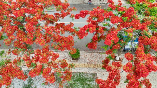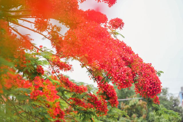 凤凰花,又称为红花楹、火树,是夏季里一道靓丽的风景线。它的花朵大而鲜艳,红得热烈而奔放,犹如一团团燃烧的火焰,在绿叶的映衬下显得格外醒目。
