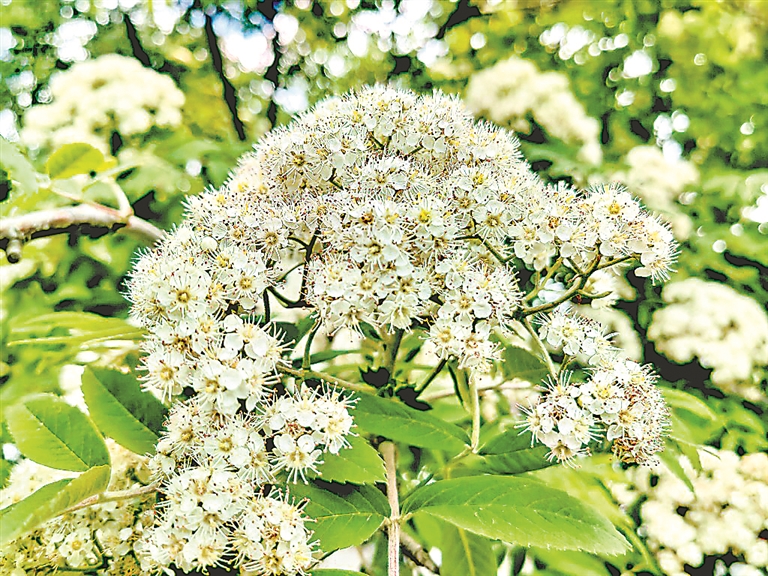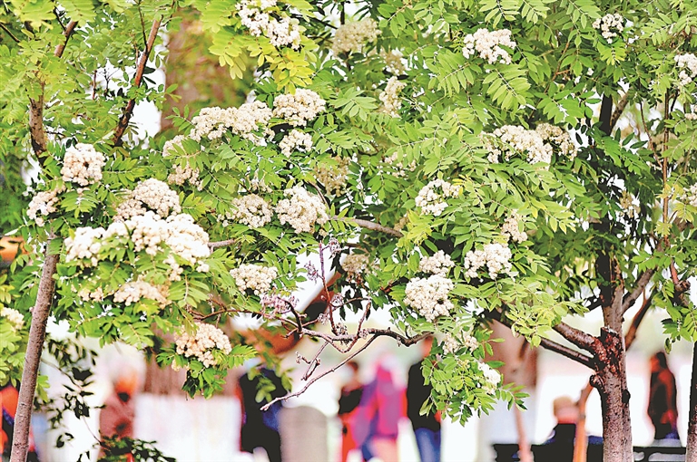 日前,哈尔滨市道里区松花江畔,四五棵花楸树上,白色的花朵迎风绽放,非常美丽,吸引许多游人观看、拍照。