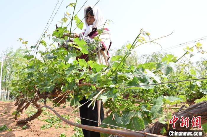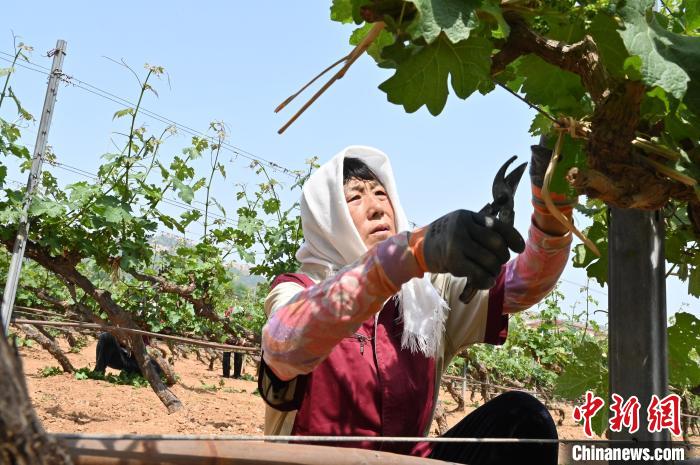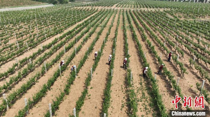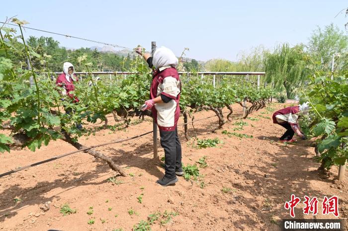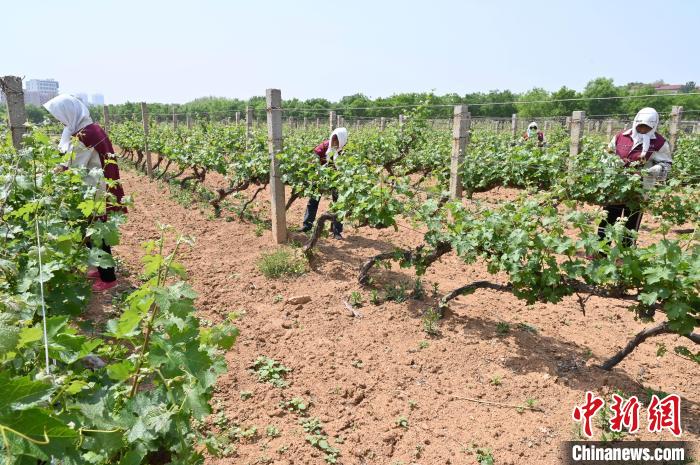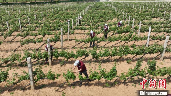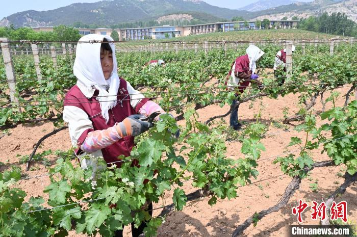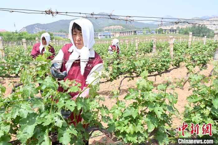 5月14日,位于河北省秦皇岛市昌黎县碣石山脚下的葡萄种植基地,上万亩酿酒葡萄长势喜人,果农在葡萄藤架之间来回穿梭,忙着抹芽、定梢。