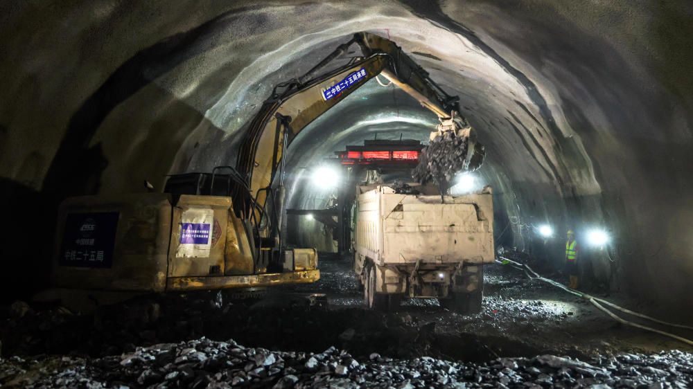 5月14日,六绵山隧道爆破完成后,施工队在进行清渣作业。新华社记者 张爱林 摄