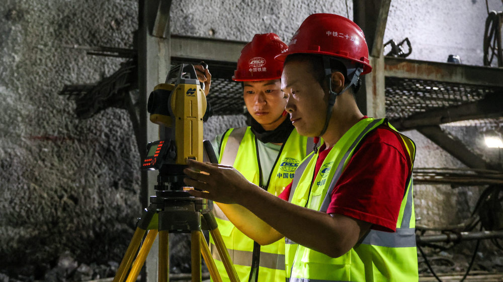 5月14日,六绵山隧道爆破贯通后,技术人员在对隧道的爆破作业面进行测量。新华社记者 张爱林 摄