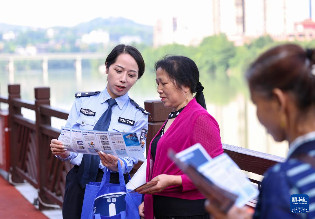 5月14日,在贵州省赤水市香樟林文化广场,民警向市民讲解防范电信网络诈骗知识。