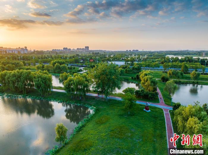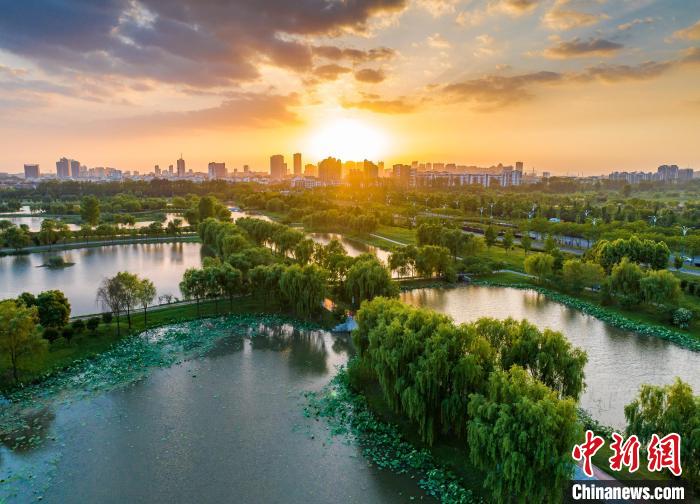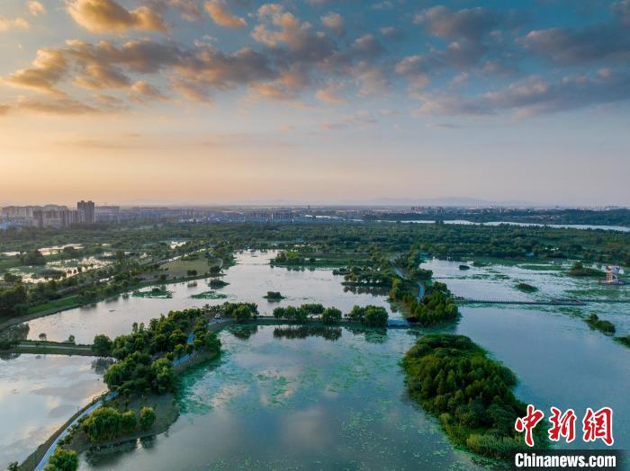 5月15日,安徽省池州市贵池区平天湖湿地公园,在日落的映衬下展现出别样的魅力。太阳缓缓下沉,天空中的云彩呈现出橙色和蓝色的渐变,仿佛是大自然调色盘上的绝美色彩,余晖洒满了整个天空和水面。湿地里的树木郁郁葱葱,绿意盎然,湖泊水面上漂浮着荷叶和水草,随风轻轻摇曳,城市天际线在晚霞余晖中熠熠生辉,如同一幅自然与城市和谐共融画卷。