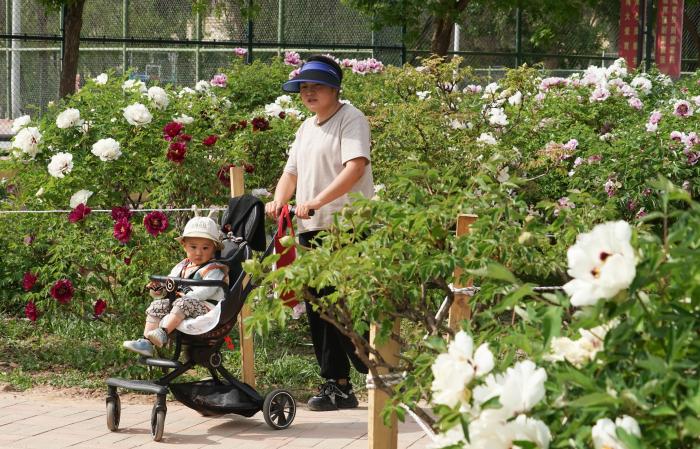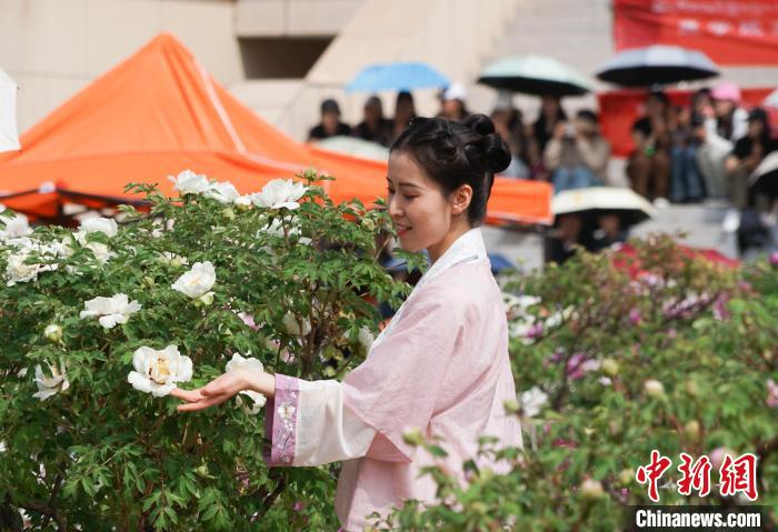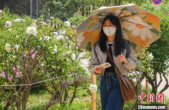 图为5月16日,青海民族大学学生在牡丹花丛中赏花拍照。马铭言摄