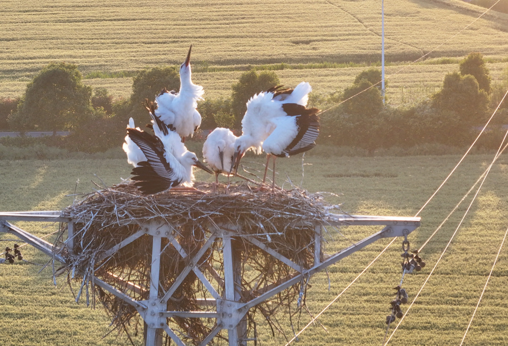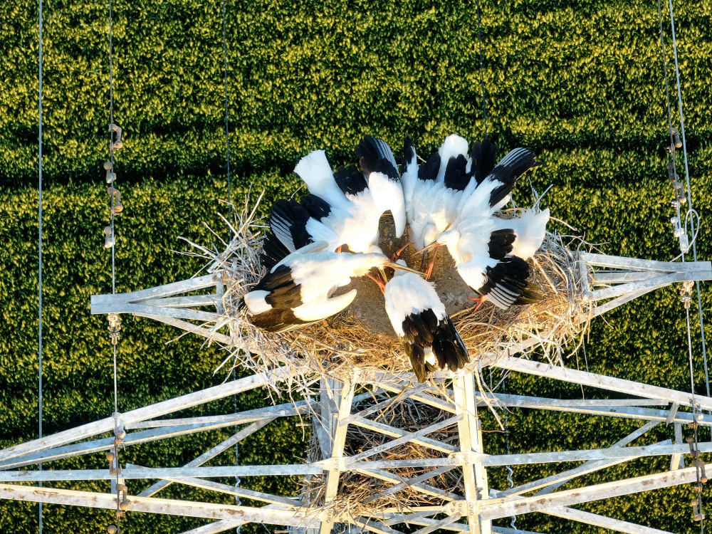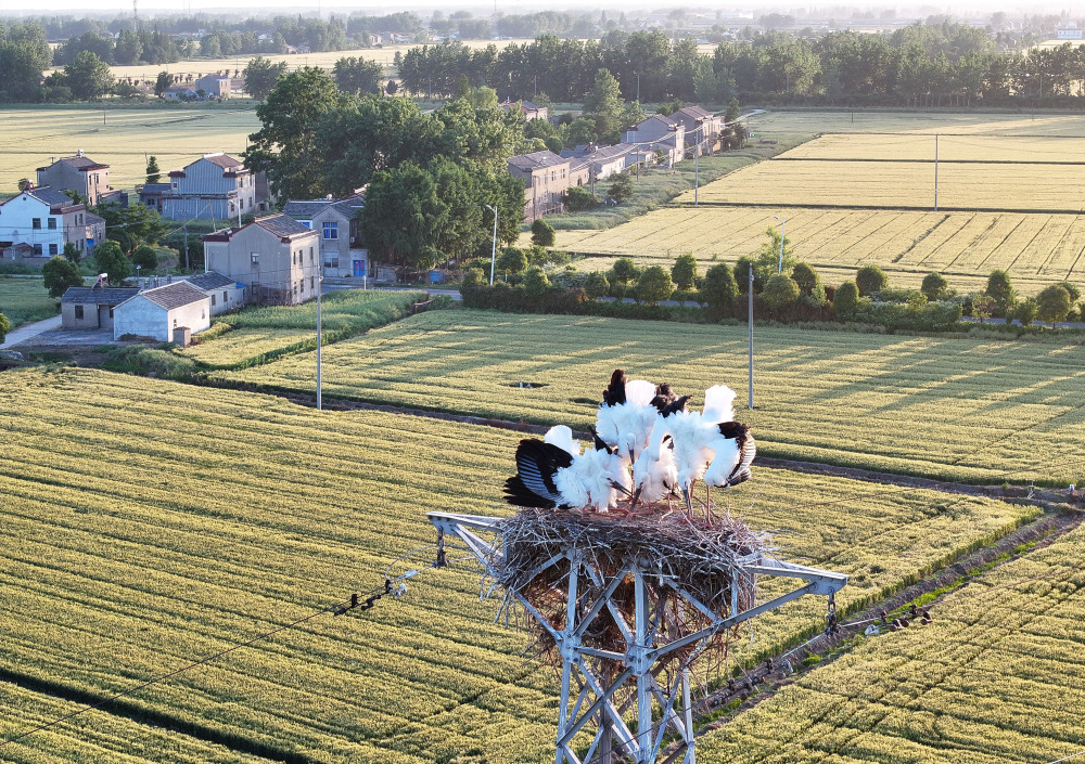 5月16日,东方白鹳栖息在高邮市周山镇江苏之心地理信息园旁的铁塔上(无人机照片)。新华社记者 季春鹏 摄