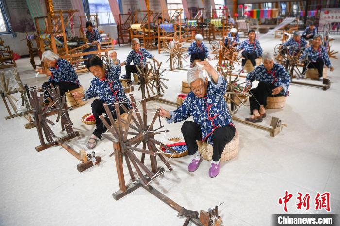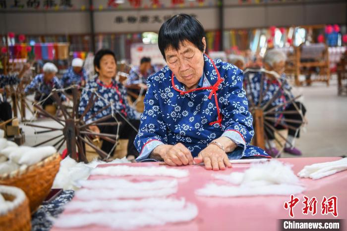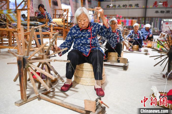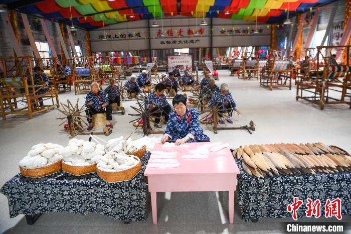5月21日,山西永济东开张村,纺织艺人在车间制作手工土布。惠畅土布制作技艺于2021年被列入国家级非物质文化遗产名录。近年来,当地探索“非遗+合作社+农户”的模式,推进传统技艺传承和产业振兴。