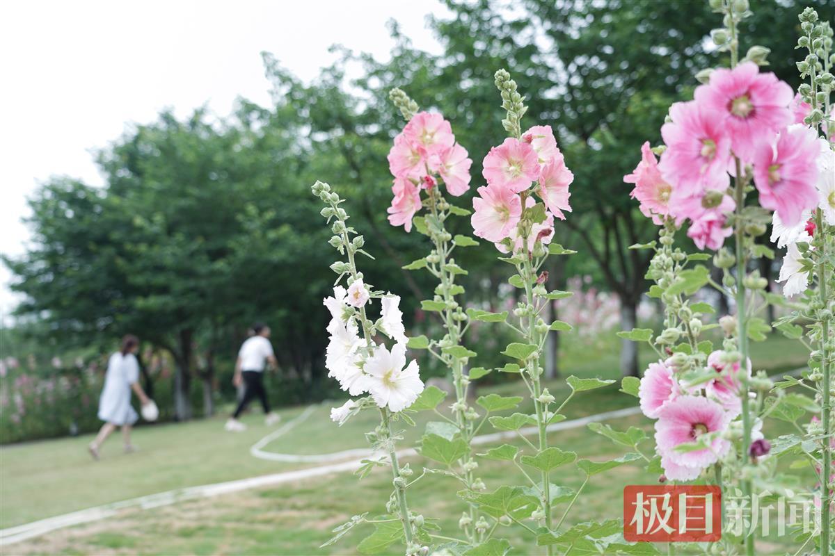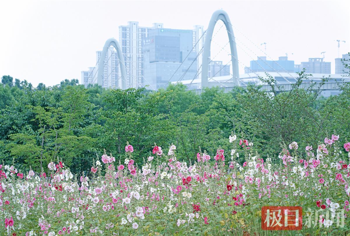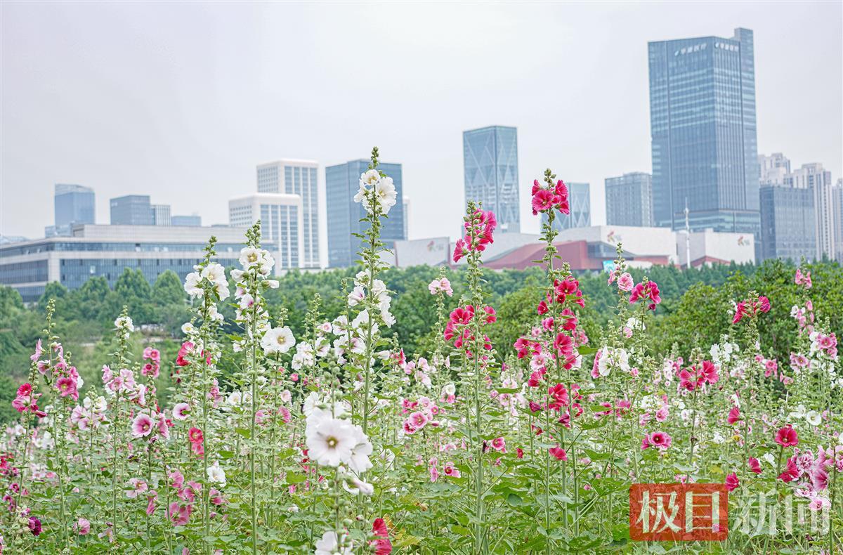 5月20日,位于武汉光谷四路的西苑公园里,成片的端午花盛开。从不同角度观看,端午花或与空轨同框,或与拔地而起的高楼相伴,美丽的风景吸引了市民休闲游玩。端午花学名蜀葵,因其在端午节前后开花,故被称为端午花。