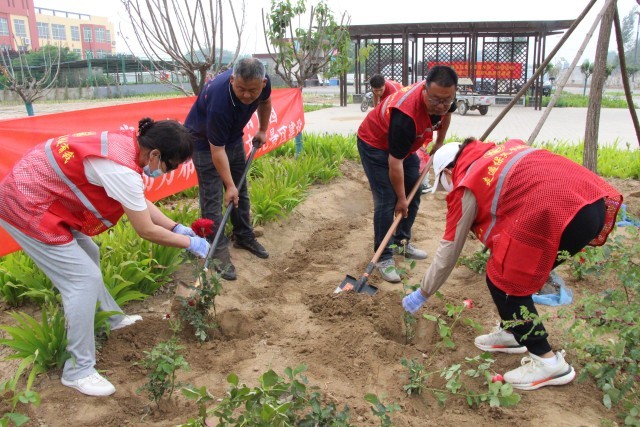 “挖坑、填土、搬运、浇水、修剪……”5月19日,在通往河北省高阳县布里留法工艺学校旧址的留法街上,到处是人们移栽月季的身影,大家分工明确、干劲十足,现场一派热火朝天的景象。
