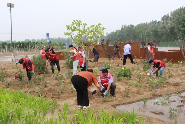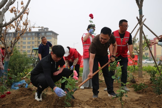 5月19日,志愿者团结协作种植月季。杨瀰摄